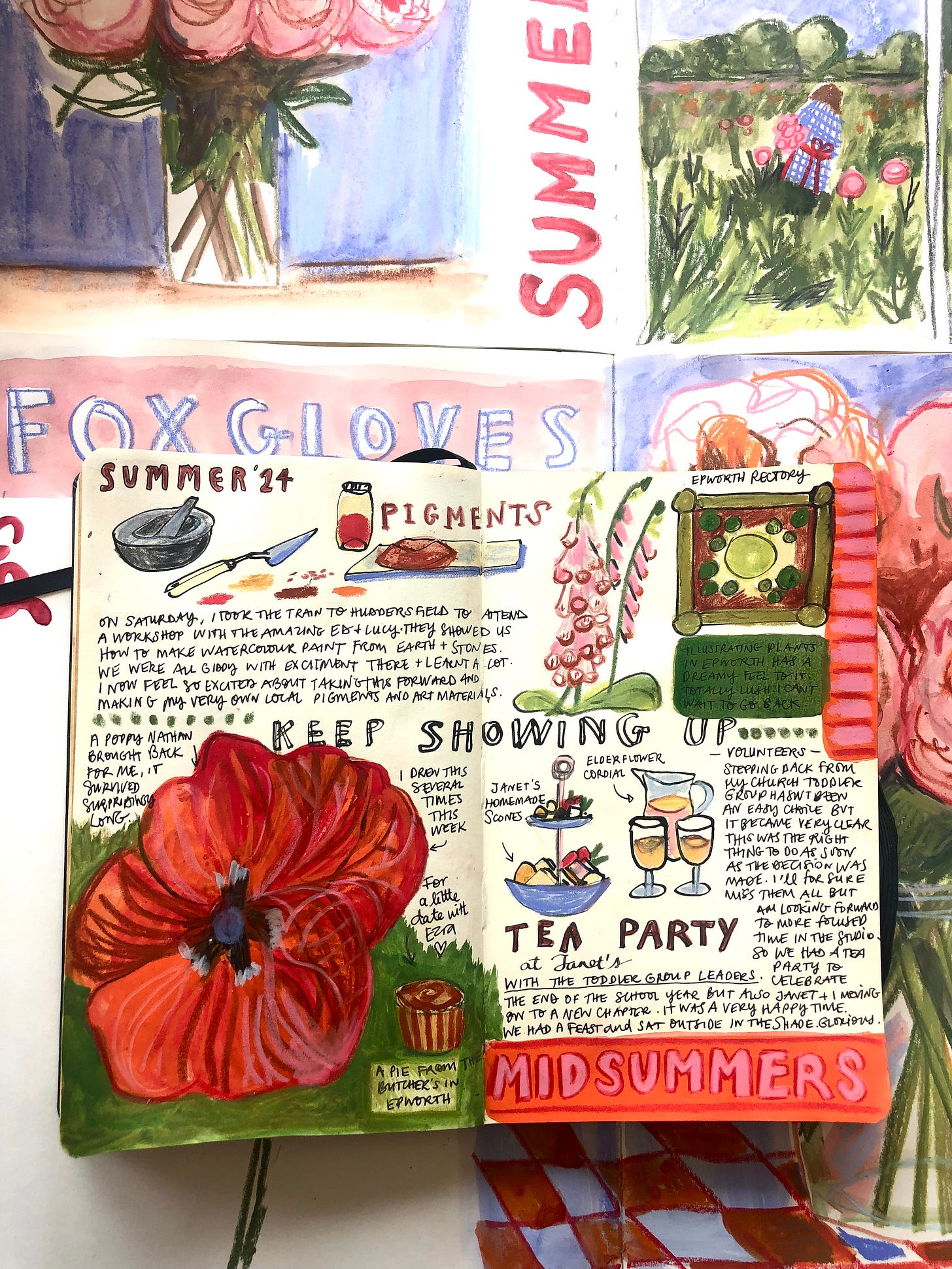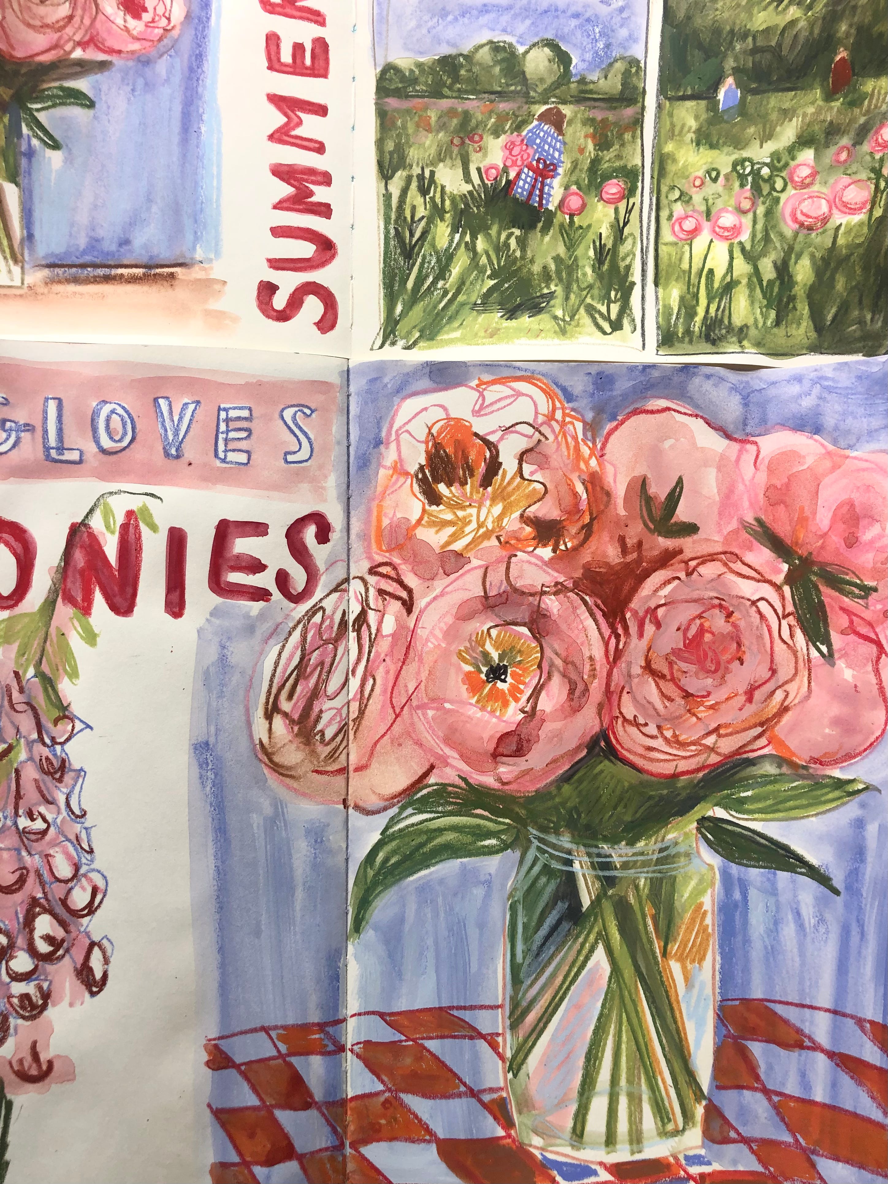 I couldn't add this to the spread because it happened after I drew my journal but I loved taking part in Charlotte Hamilton’s zoom drawing session last night which was all about peonies. I couldn’t think of a better way to celebrate Midsummers!! I used Neocolor IIs mainly for this in 2 Pith sketchbooks.