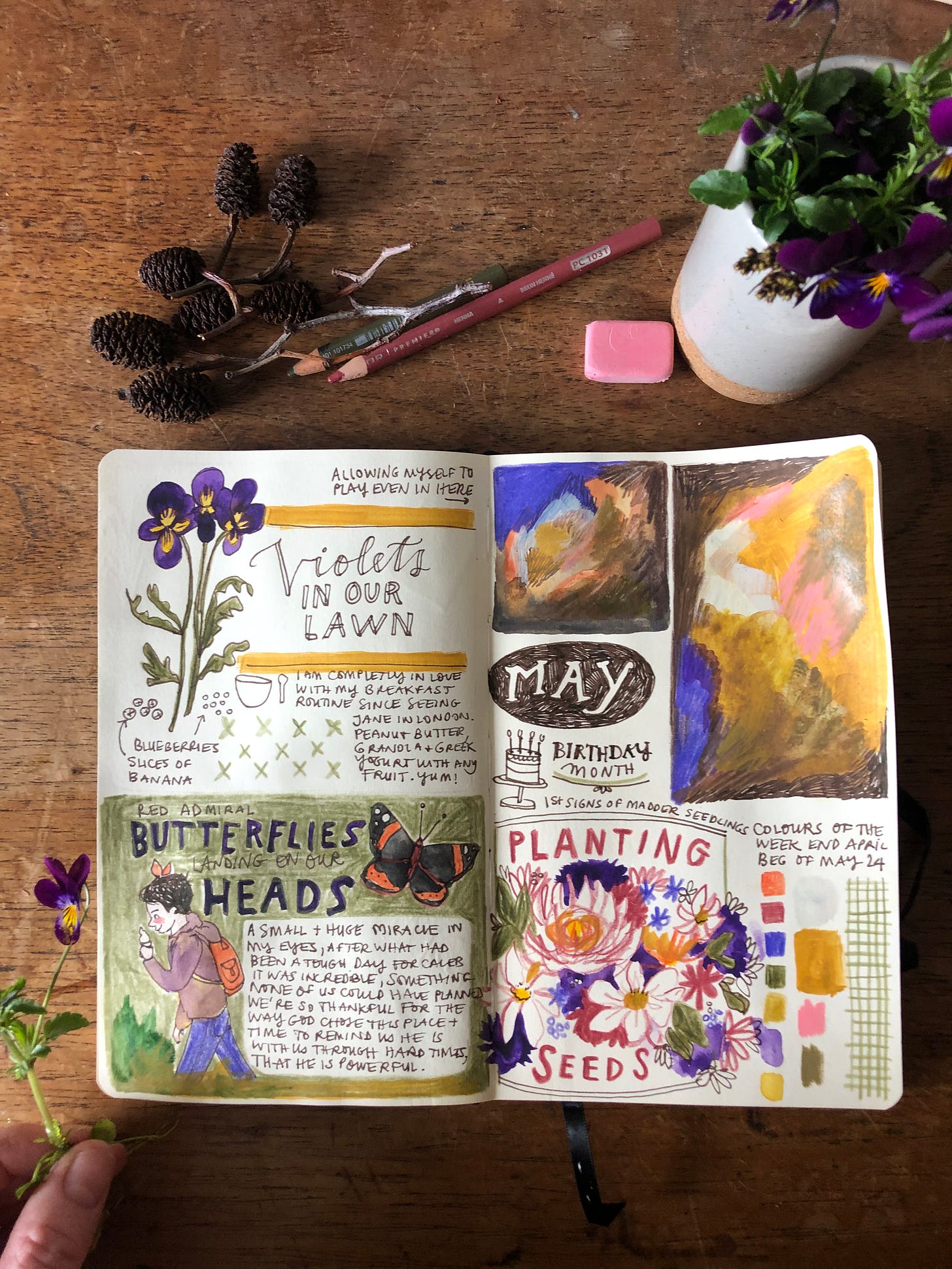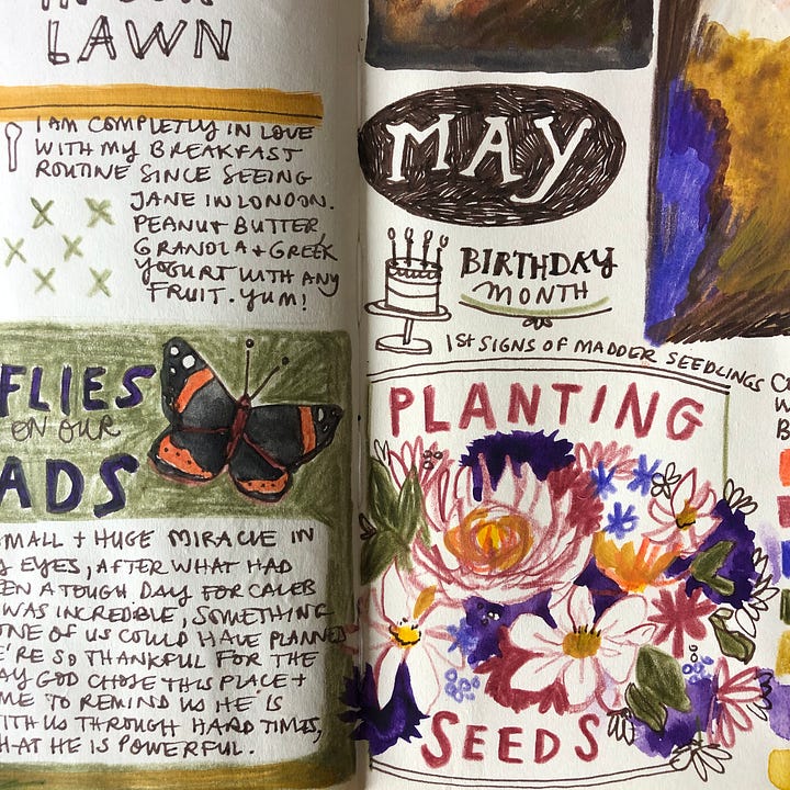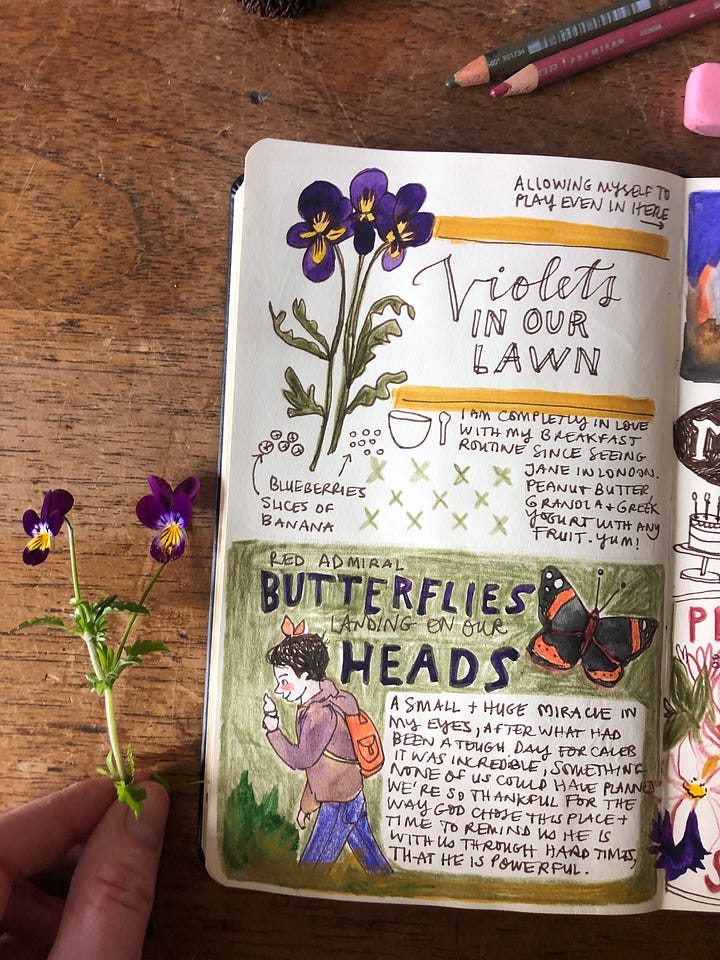 Visual journals of my week: Violets in our lawn, butterflies magically landing on our heads, plantings more seeds and a description of my breakfast routine.