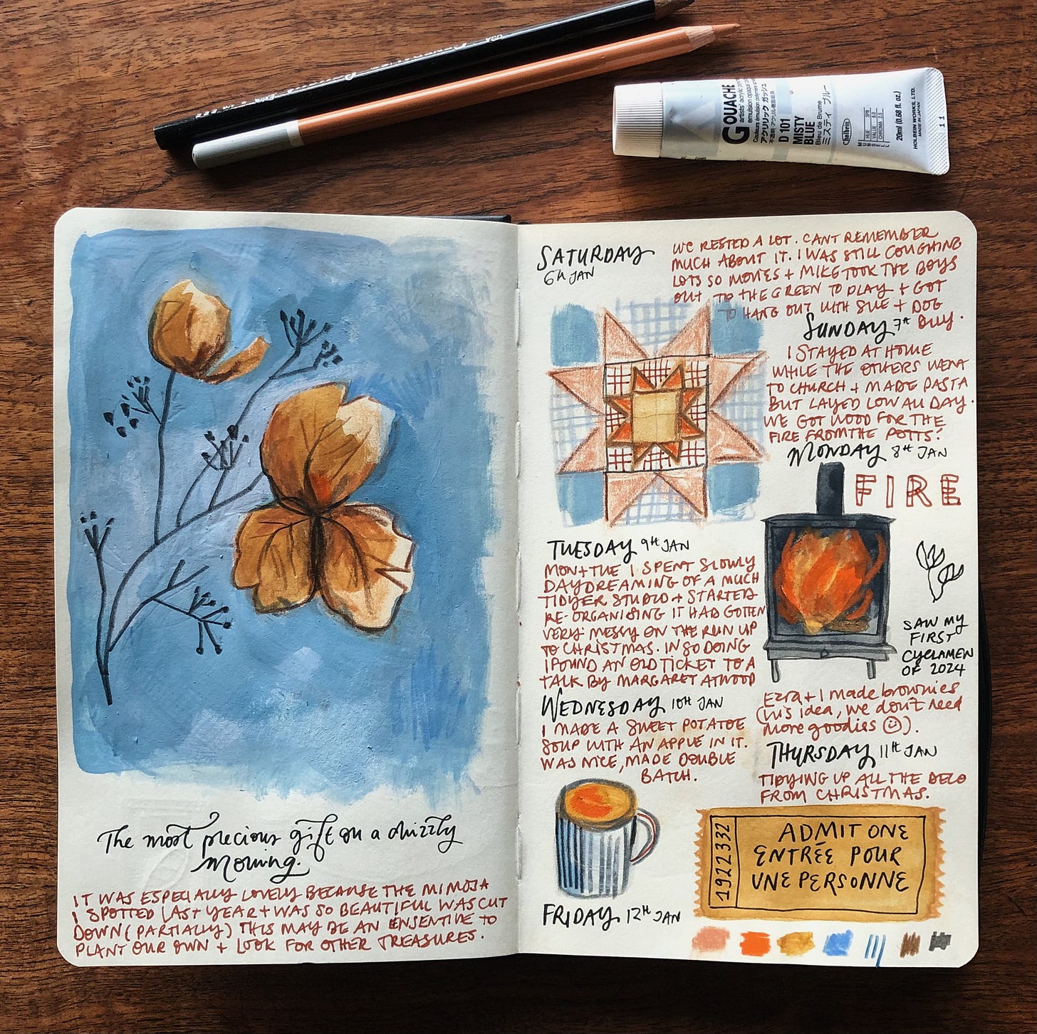Some other highlights have been having the fire on in the stove again (we had run out of wood), making a lovely sweet potato soup (that has an apple in it), and then even working with these colours today has also felt quite lush. I’ve just noticed I smudged the right page (in the Wednesday section) which I’ll try rubbing out but I’m not too precious about that. I’m under no illusion that this sketchbook will get a little dirty throughout the year.