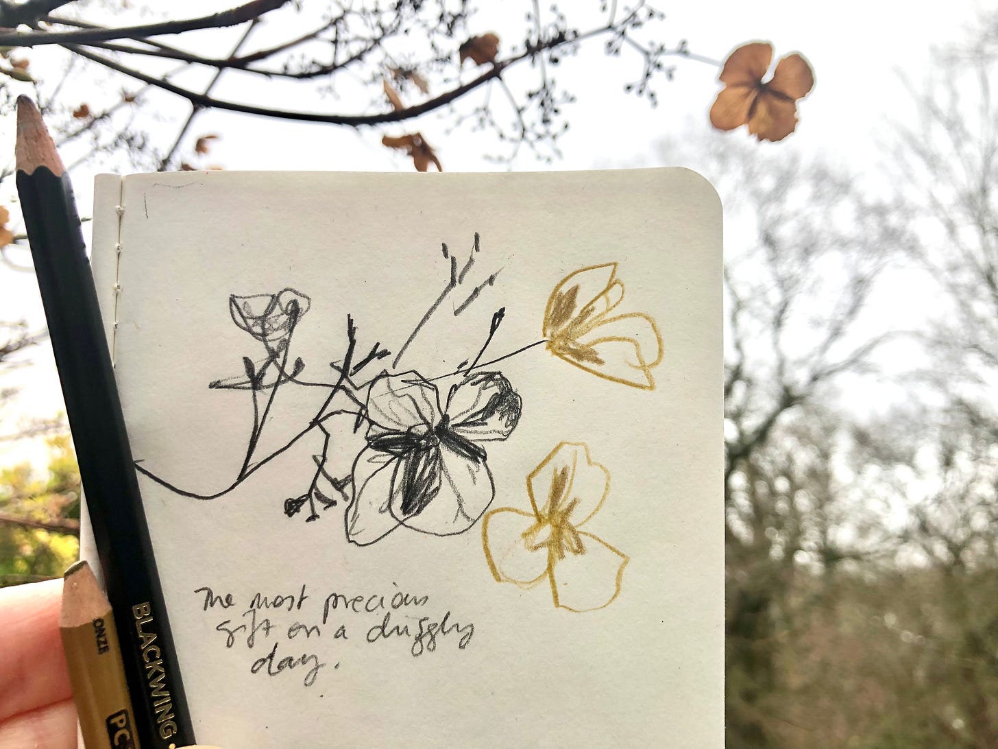 Today I’m sharing 3 videos, two of the journaling process at my desk and one of a little treasure I found while on one of my daily walks, some gorgeous dried hydrangeas. I had my tiny Moleskine sketchbook with me so made a quick sketch on location, using my Blackwing and Prismacolor bronze pencil.