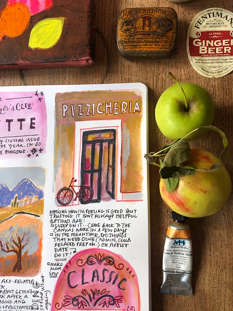 This week in the studio I painted landscapes inspired by my time in Italy and some more still life using the Sennelier oil sticks I bought in Paris. It sounds idyllic but I struggled to get past some real fears (mainly fear of failure) and the inner critic was a little louder than usual. So after journaling quite a bit and talking with some good friends, it became clear that a solo artist date was in order. With this in mind, I sat down to do my visual journals a day early and did them in two takes.