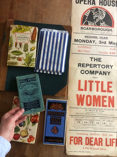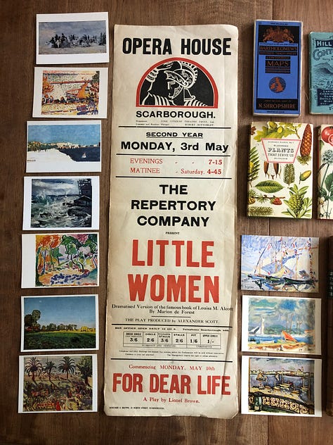 Yesterday, I had a solo date at a local antique centre and had a blast! It was so fun to drive, see the countryside at this time of year, listen to Radio 4 (there just happened to be a fantastic interview with artist Angela Harding on). I had a few items to look for, including some old art postcards for my founding members bundles which helped me move fast with a focus but just seeing the old colour combinations and typography was so good for my soul!! And I found an incredible poster for a Little Women performance at the Opera House of Scarborough which of course had to come home with me!