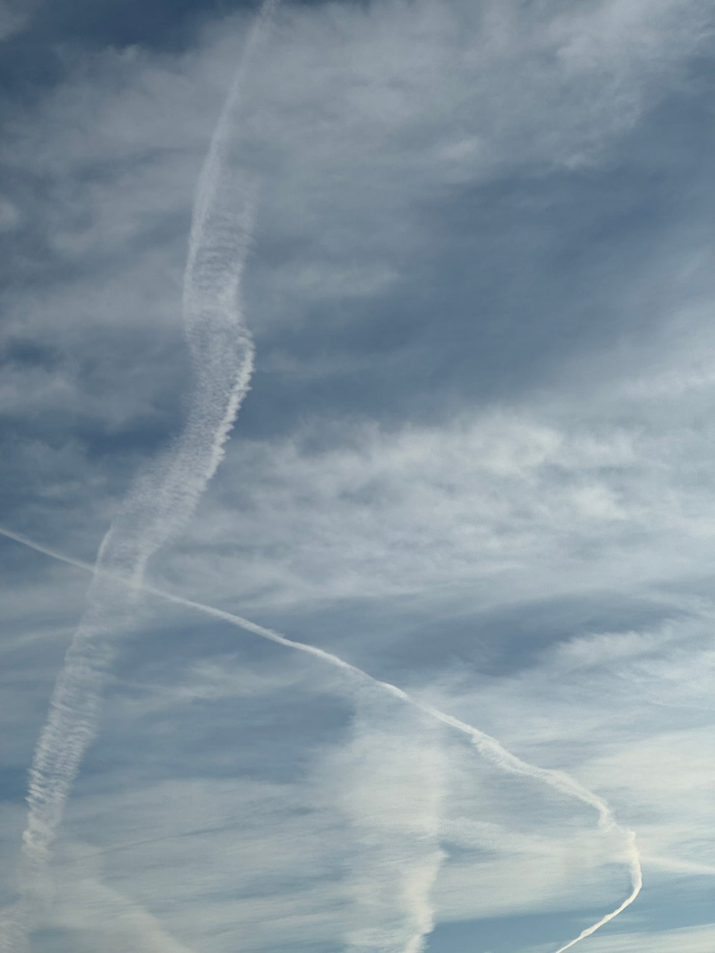 On Wednesday I texted a friend: “Saw this sky and felt inspired by the layers of plane marks on top of the layers of clouds. Was a bit of a revelation as I see a real parallel with my current methodology in this body of work: my base of acrylic (like the sky and clouds) and then oil sticks go on top (like the marks the planes have left). In other words, I do not need to worry about this stage being unfinished looking because I haven’t started the 2nd stage yet.”
