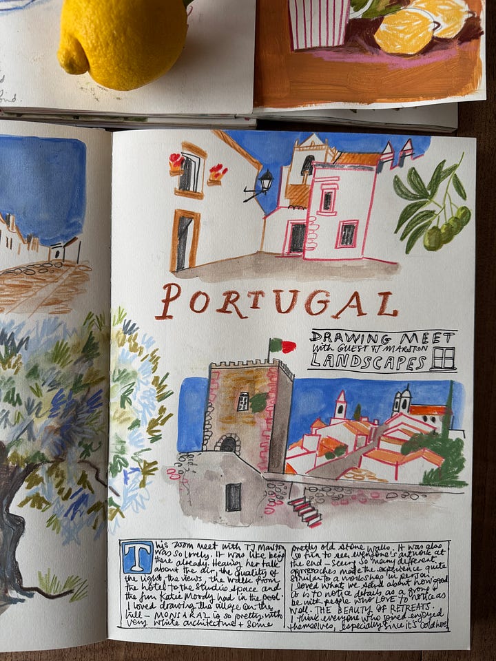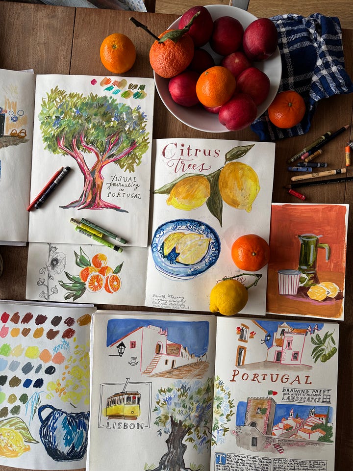 Thanks to those who’ve already signed up to the Visual Journaling Retreat in Portugal. We have a few spots still available and I’d love for you to join! We will look at composition, layout, colour choices, while sketching landscapes and still life with local produce. Think of alllll the citrus!!! As well as a dedicated art studio for some focused workshops, we will have opportunities to sketch outdoors. Here is the full program, this might be just right for you! There are shared rooms and individual rooms. Feel free to share this link with anyone you think might enjoy a bit of sunshine and creativity come May!